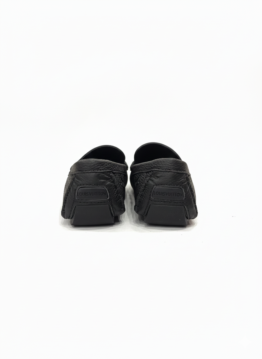 Color and Material: The shoes are a solid black color. The material appears to be a pebbled or grained leather (or a synthetic material mimicking this texture), giving them a rich, slightly textured finish.